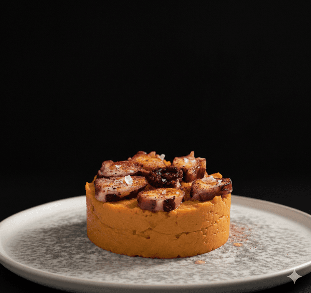 Pulpo a la plancha con base de Patata revolcona, decorado con Pico de gallo y AOVE