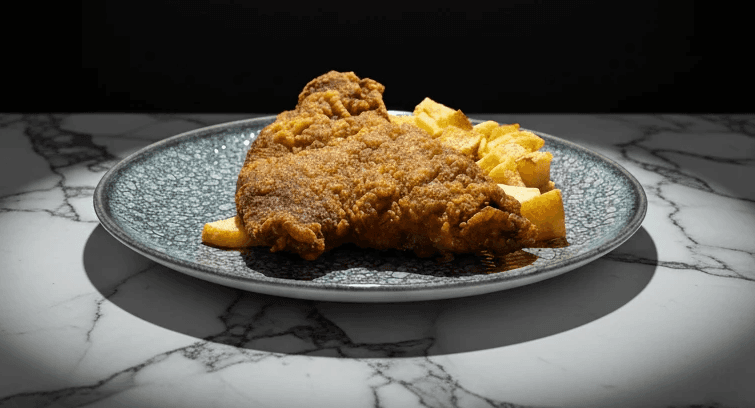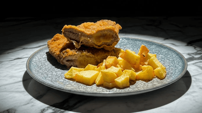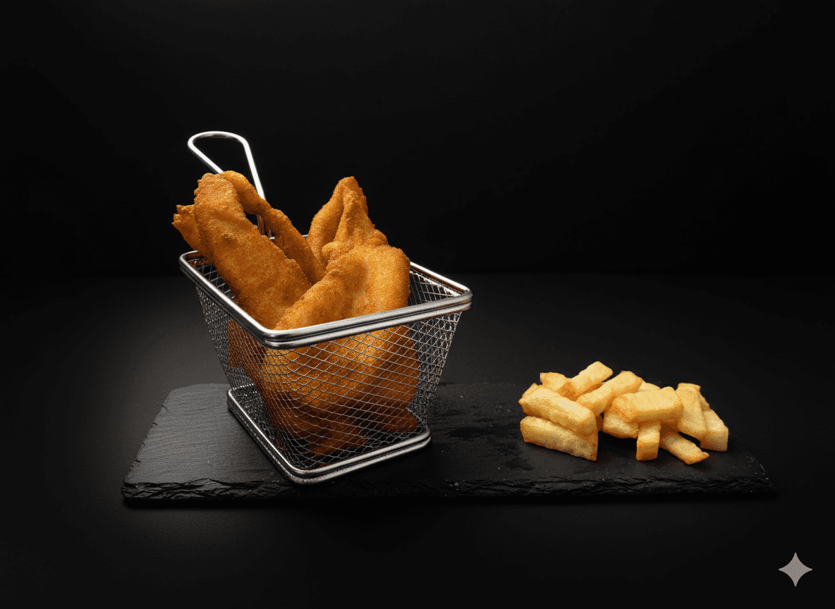 Finger de Pollo caseros con Mostaza y Miel acompañados de Patatas Fritas