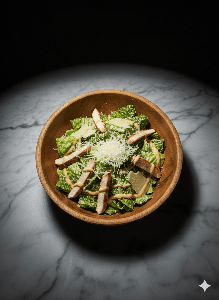 Lechuga, tiras de Pollo, Salsa Cesar casera y Queso Grana Padano rayado