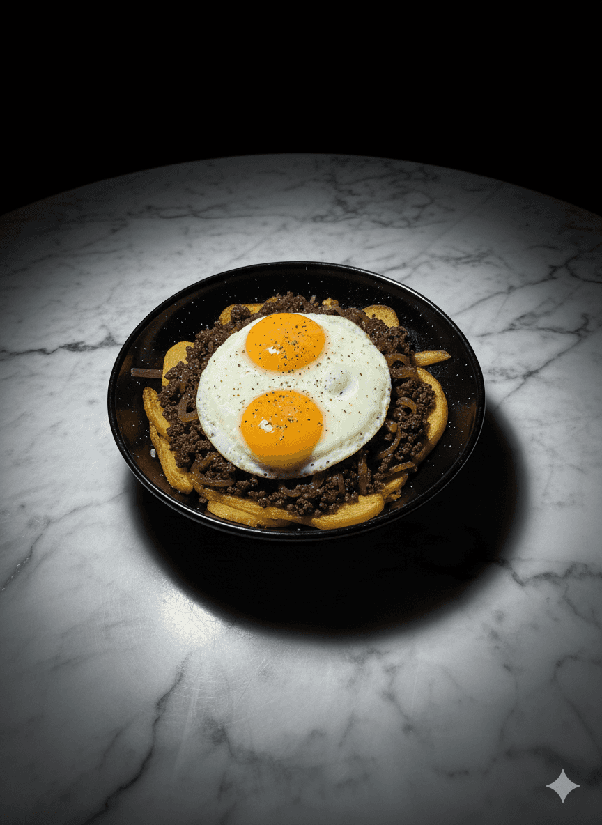 Huevos fritos, Morcilla y Cebolla caramelizada con Patatas Fritas