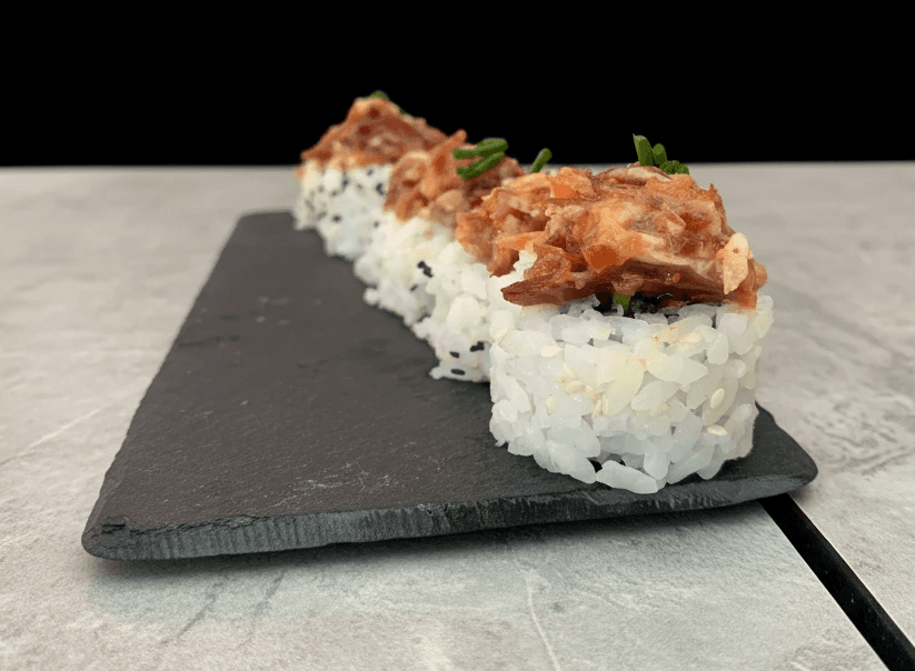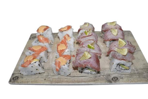 8 UNIDADES. 2 Uds. de Salmón, 2 Uds. Atún, 2 Uds. De Jamón y 2 Uds. Pulpo a la Brasa. Opción eleccion del chef