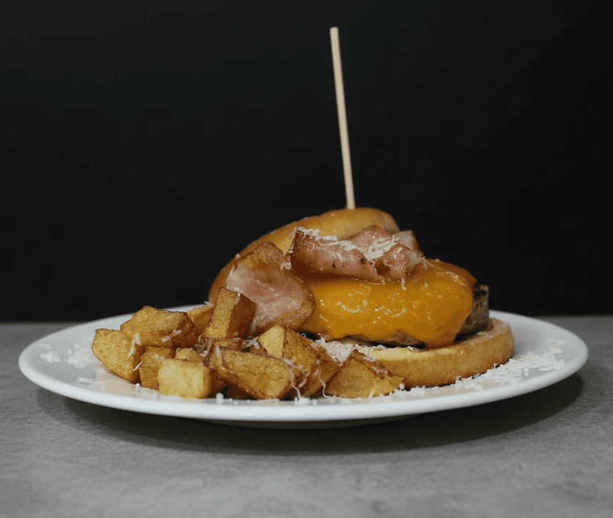 Pan Brioche, Carne a elegir: ANGUS, VACA MADURADA O POLLO, con Bacon y Queso crema, Cheddar y Grana Padano Suplemento extra de Queso Azul +0,50€