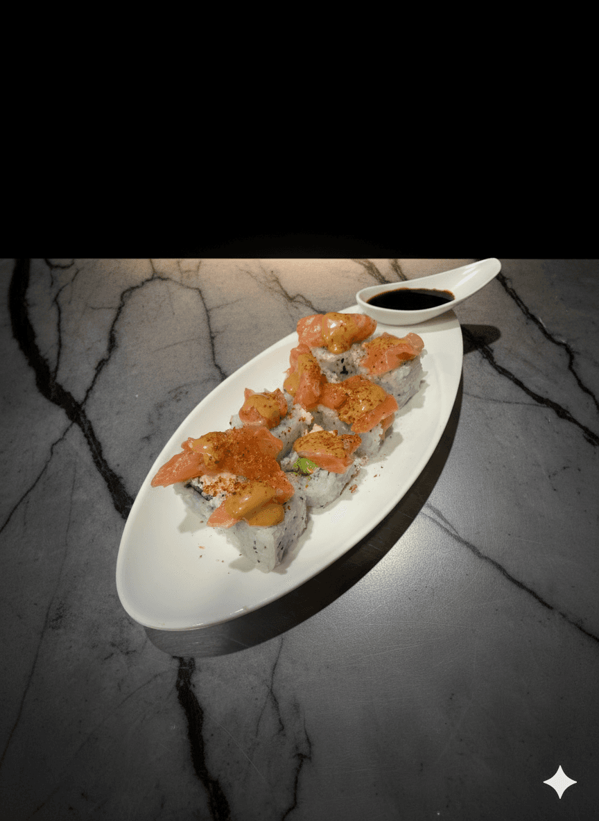Aguacate, Queso Crema, Alga, Arroz, Topping de Salmón con Salsa Mayo Kimchi y Tajín