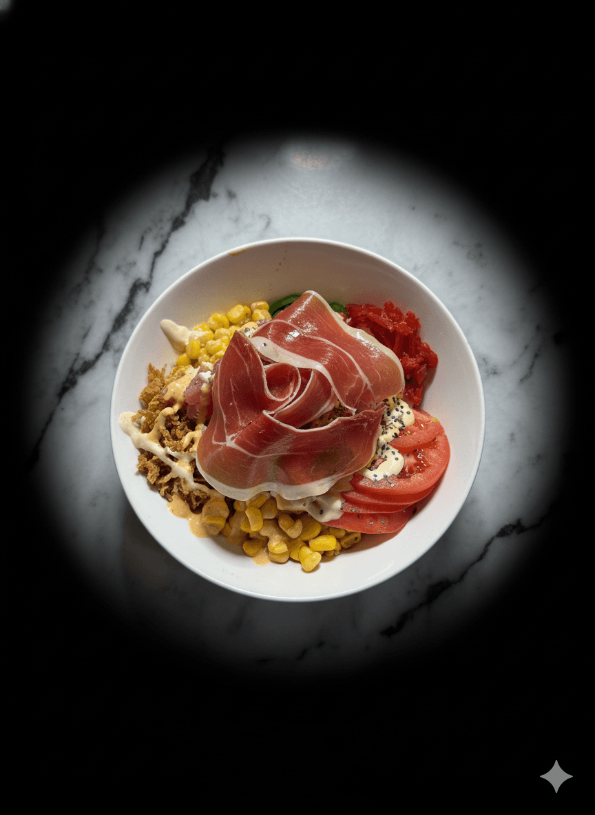 JAMON IBÉRICO +Arroz + 5 Ingredientes a elegir: Aguacate, Cebolla crujiente, Edamames, Maíz Tomate, Wakame Zanahoria o Fruta de temporada