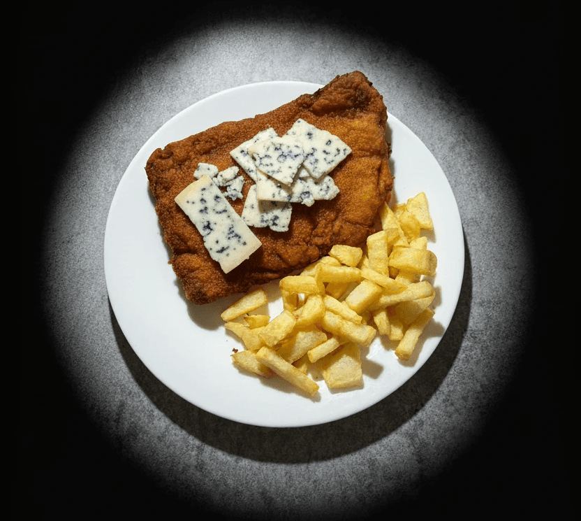 Queso Cheddar, Rulo de Cabra, Queso crema y Queso Azul con Patatas Fritas