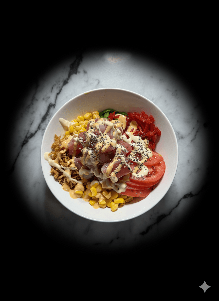 ATÚN +Arroz + 5 Ingredientes a elegir: Aguacate, Cebolla crujiente, Edamames, Maíz Tomate, Wakame Zanahoria o Fruta de temporada