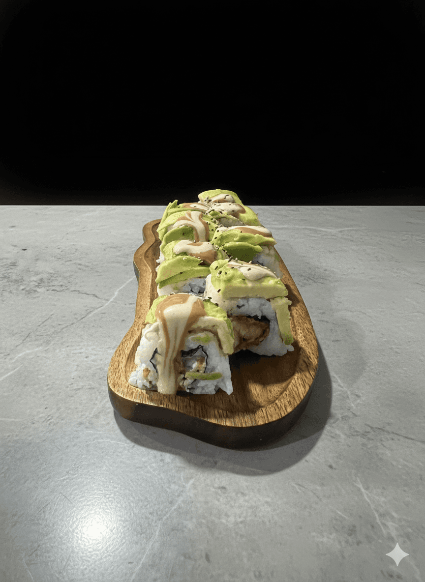 Aguacate, Queso Crema, Alga, Arroz, Topping de Lima y Atún flambeado marinado con Aceite de Sésamo