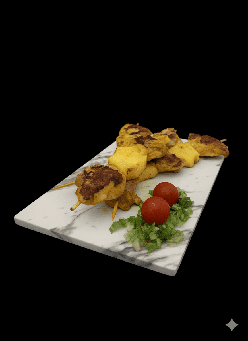 Brochetas de Pollo adobado y trozos de Piña con Guarnición a elegir: Ensalada o Patatas Fritas
