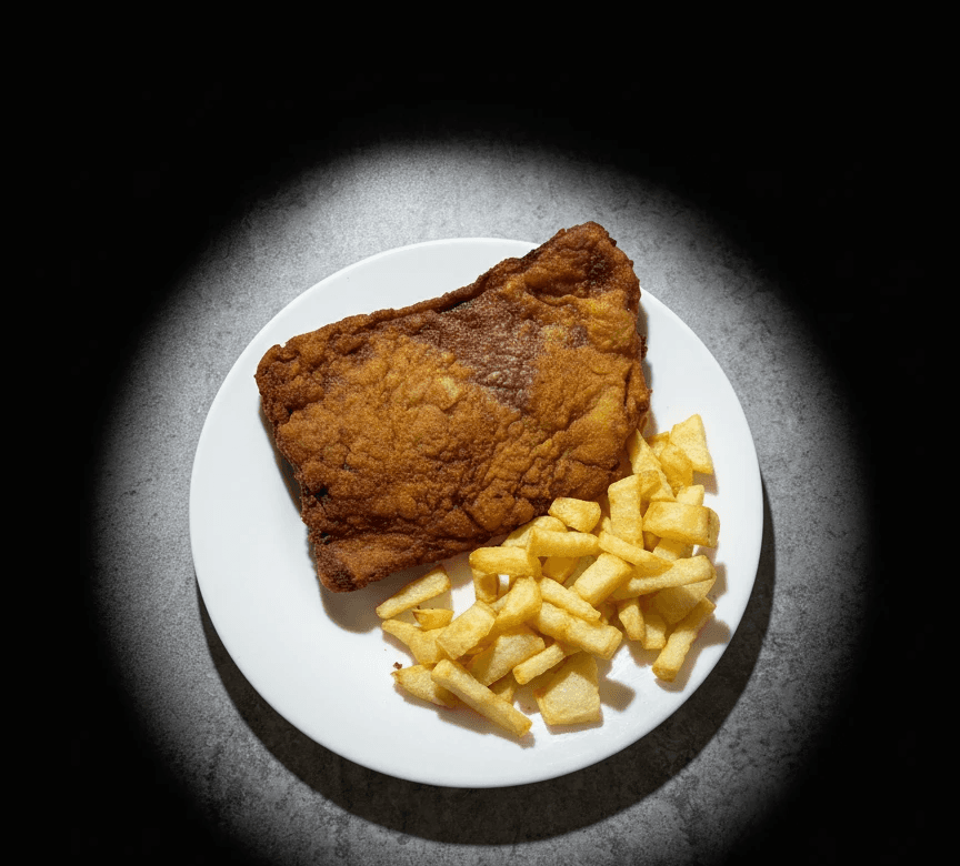 Huevos fritos, Jamón Ibérico y Queso Grana adano con Patatas fritas